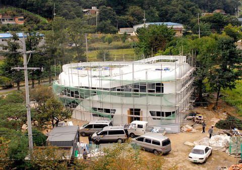 The 419m2 concrete and glass structure is rising on the site of Sim's former home in his native city of Suweon, 40km south of Seoul. Before he moves in, anyone who is flush with funds can rent it for US$50,000 a day -- with proceeds going to his campaign to provide poor countries with proper sanitary facilities.