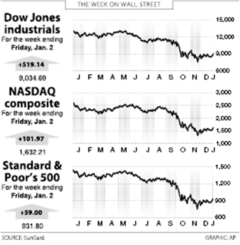 The Dow Jones Industrial Average surged a hefty 6.09 percent for the holiday-shortened week to finish Friday at 9,034.69, its highest close since Nov. 5.