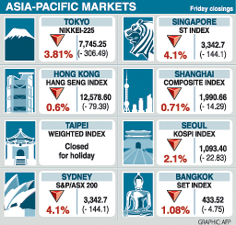HSBC Holdings PLC, Europe’s largest bank, lost 11 percent for the week after the UK and US governments were forced to provide new bailouts for banks and New York University professor Nouriel Roubini said credit losses could surpass US$3 trillion. Sony Corp plunged 13 percent after forecasting a record loss, while Samsung Electronics Co, the world’s largest liquid-crystal display TV maker, dropped 5.8 percent after posting its first quarterly loss.