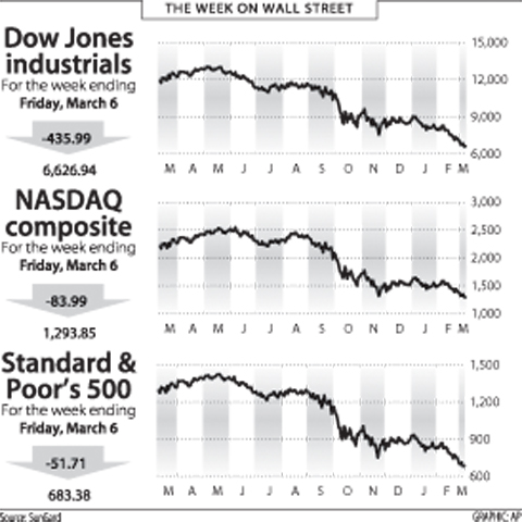 The relentless bear market savaged the Dow Jones Industrial Average of blue-chips, which fell 6.17 percent on the week to 6,626.94, just above a 12-year low.