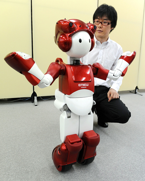 The red-and-white robot could be used as a receptionist and visitors’ guide in office buildings, Hosoda said.